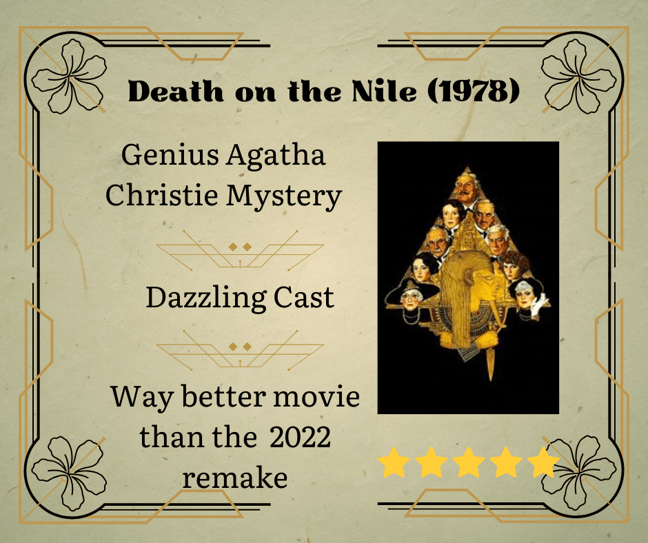 Don’t bother watching the 2022 remake, this 1978 version is the gold standard of Death on the Nile movies. The cast alone makes this movie worth watching. Alongside Peter Ustinov as Hercule Poirot, the dazzling cast includes Dame Maggie Smith, Bette Davis, Dame Angela Lansbury, Mia Farrow, Olivia Hussey, Bond Girl Lois Chiles, David Niven, Jack Warden, George Kennedy, and more.