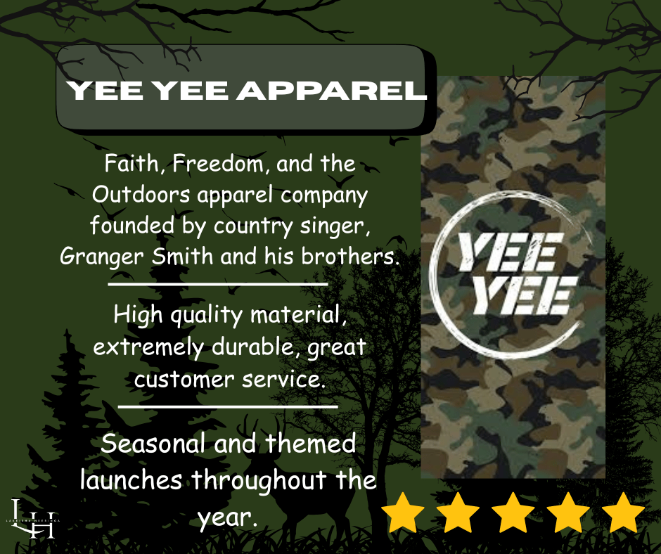 Yee Yee Apparel is a faith, freedom, and outdoor apparel and lifestyle company founded by three brothers in Texas. Originally the catch-phrase of country singer, Granger Smith, Yee Yee appeared on merch for years before the brothers, Granger, Tyler, and Parker, shifted gears from generic concert merch and began making high quality clothing.